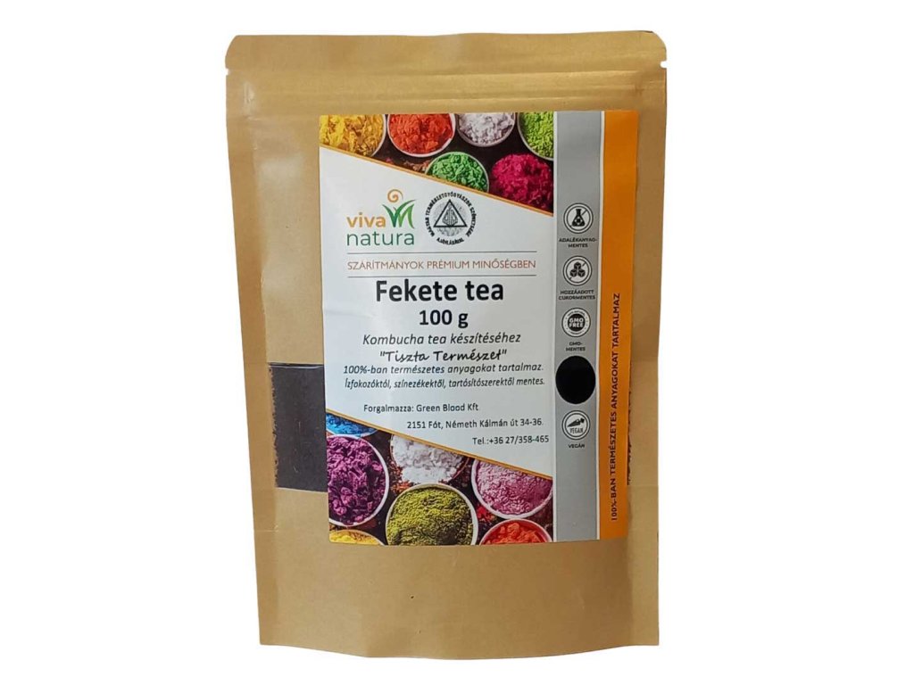 Viva Natura prémium FEKETE TEA kombucha tea készítéséhez 100 g A Jakab Kombucha koncentrátumok készítéséhez több mint 25 éve ezt a fekete teát használjuk. „…A fekete tea a zöld tealevelek fermentálásával – speciális hőkezeléssel készül. A kiváló minőségű fekete tea optimális környezetet teremt a kombucha számára szükséges jótékony baktériumok és élesztők növekedéséhez. Ez segít biztosítani, hogy a kombucha fermentációja zökkenőmentesen és hatékonyan menjen végbe.Összetevő: