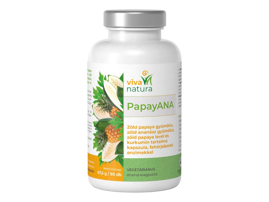 PapayANA - Zöld papaya gyümölcs, zöld ananász gyümölcs, zöld papaya levél és kurkumin tartalmú kapszula, fehérjebontó enzimekkel vegetáriánus étrend-kiegészítő