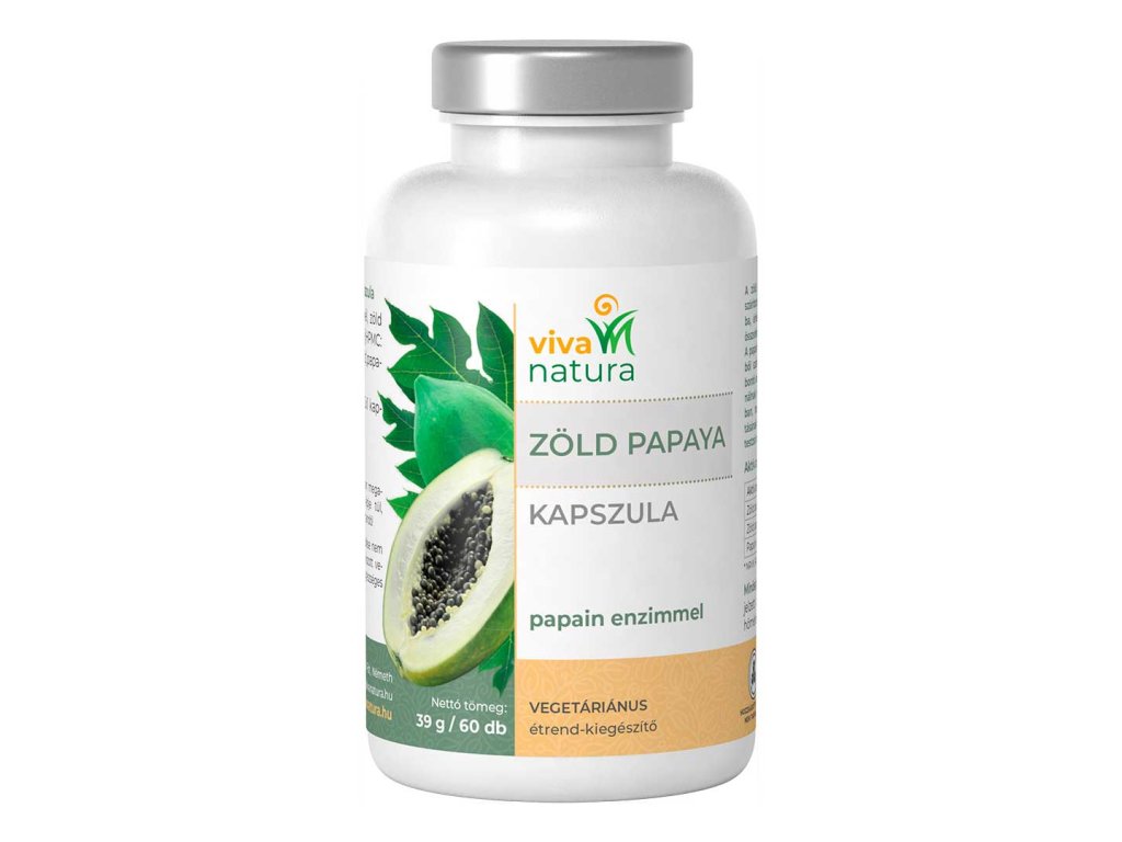 Nettó tömeg: 39 g/60 db Zöld Papaya papain enzimmel kapszula zöld papaya levelét tartalmazza - és papaya gyümölcspor gondosan szárított és finomra őrölt formában kerül a kapszulába, értékes tápanyagaikkal gazdagítva a termék összetételét. A papain enzim a papaya gyümölcséből származó természetes fehérjebontó enzim, amelyet gyakran használnak emésztést segítő formulákban, továbbá proteolitikus aktivitásának köszönhetően hozzájárul a testzsír csökkentéséhez.Zöld Papaya kapszula összetevők:
